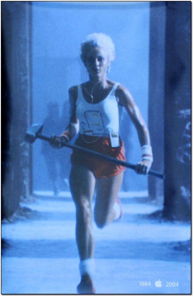 In 2004, Apple released a commemorative poster to celebrate the 20th anniversary of the Macintosh. It featured the iconic sledgehammer tosser from the most famous television commercial ever made, “1984.” But this time, she’s listening to an iPod.