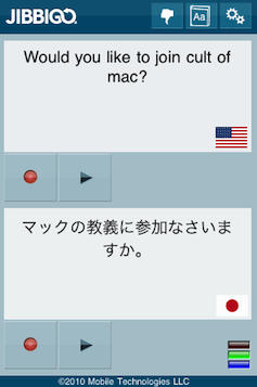 Jibbigo, by Mobile Technologies, is a bilingual translation app for the iPhone and iPod Touch that translates your speech directly into several different languages. The app currently supports English to Spanish, Japanese, Chinese or Iraqi, and visa versa. Each is sold separately. Jibbigo costs between $24.99 and $27.99 and is available for download via iTunes store link. Mobile Technologies says it will support other languages in the future.