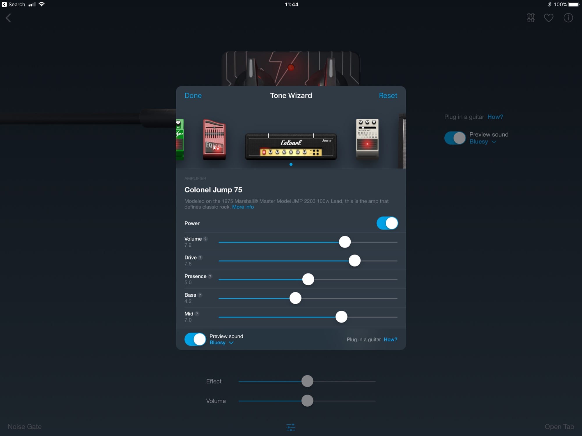 Tonebridge v2.0 brings the Tone Wizard, a subscription-based feature that reveals the pedals and amps behind each tone. With an active subscription ($6 per month), you just tap the little settings icon to show the “gear” view, which is essentially a chain of little icons of actual guitar pedals, with sliders beneath them to change parameters. In this view, you can tweak the settings as much as you like, which is pretty neat, but you cannot add pedals that aren’t already present. There’s a three-day trial to check this feature out.