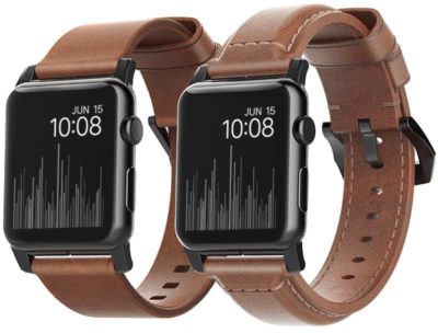 French-company Clessant makes a gorgeous Barenia leather band in “gold” — which really looks more like a rich Peruvian brown) — and black (shown). Both black and gold Barenia bands come in 42mm and 38mm sizes, with four Apple-y lug colors — silver stainless steel, silver aluminum, space gray and space black.