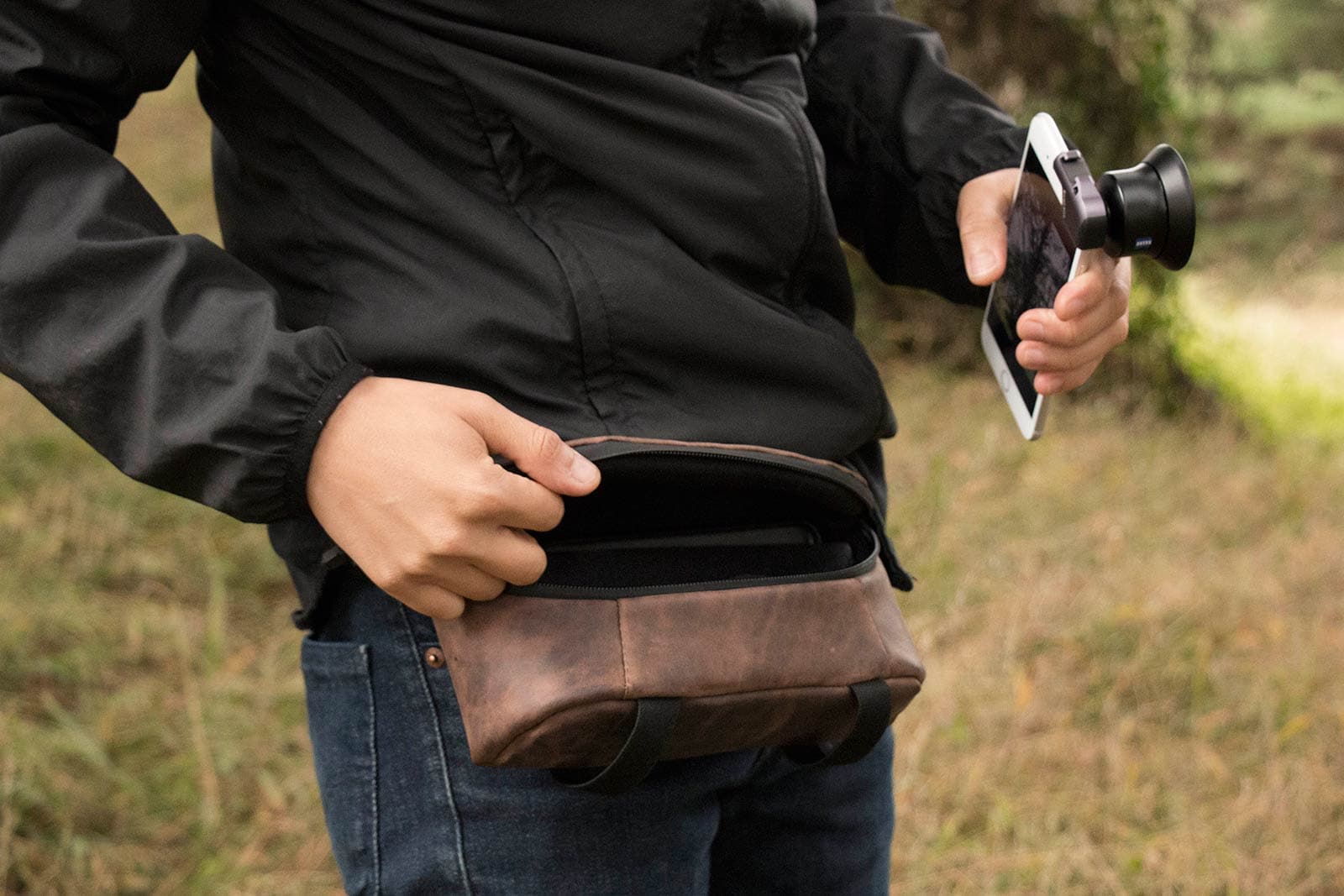 The WaterField bag, a late 2017 arrival, comes in a durable ballistic nylon or rich-smelling leather with a padded interior that can hold up to four lenses or two lenses and two Lume Cubes. There’s also a zippered mesh pocket for small items and main pocket for an iPhone and battery. Expandable bands on the bottom hold a mini tripod.