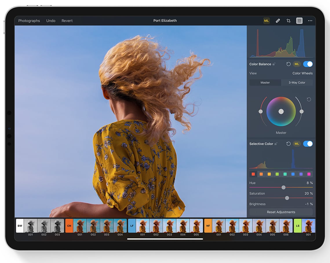 Pixelmator Photo’s ML Enhance feature uses an algorithm trained on 20 million professional photos. It automatically improves things like white balance, exposure, and every individual color range in an image to deliver the best result.