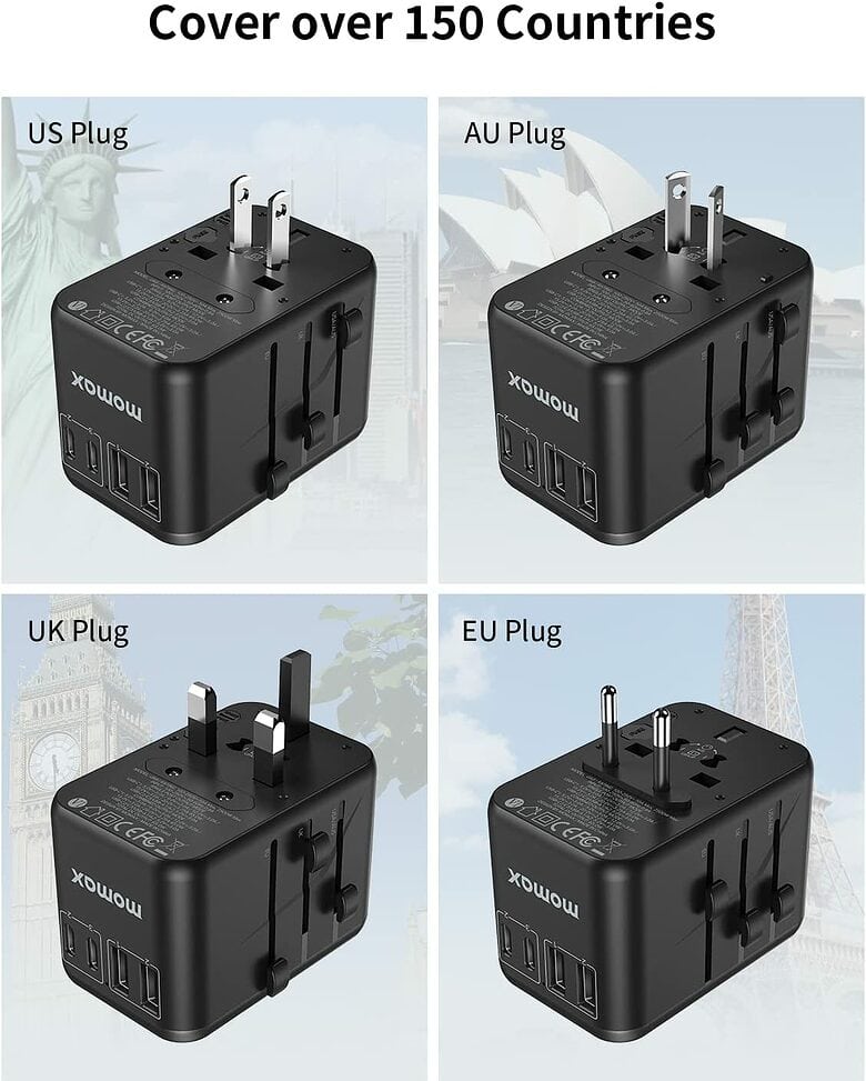 - All-in-one travel adapter with built-in US/JP/CN, AU, EU and UK sockets covering more than 150 countries.