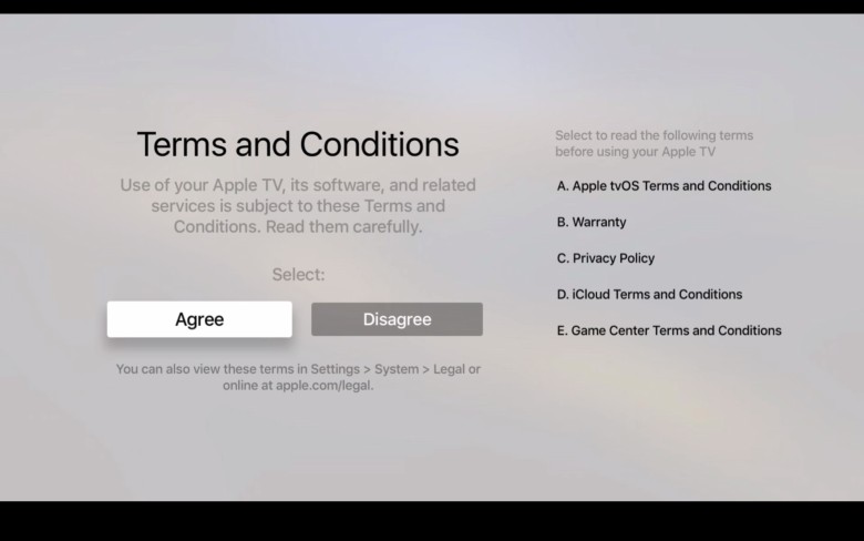 You’ll want to enable location services in this next step, so that Apple can figure out where in the country you provided in step one above you are (I guess — there’s not any documentation I could find on Apple.com). If you know why a stationary TV box needs to know your location, please feel free to drop a note in the comments.