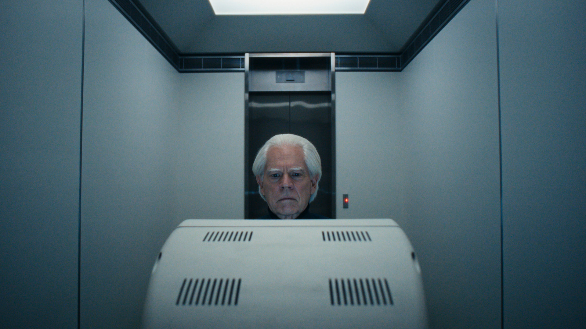 Blood-soaked and desperate, Mark finds the Cold Harbor room and chases off the nurse (Sandra Bernhard). Realizing the handprint pin-prick security device won’t grant him access, he uses Drummond’s blood from his tie to trick it.