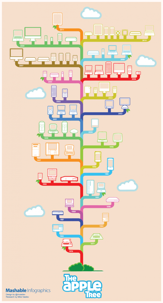 Mashable has put together a wonderful infographic, called “The Apple Tree.” What would Apple products look like if they were placed into a family tree? Find out after the break!