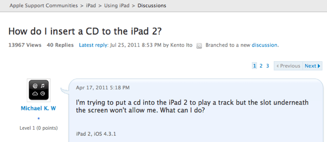 I’m not sure whether this guy over on the Apple Support forums is genuine, or whether he’s set up this thread purely for fun, but either way it’s hilarious. Having recently purchased an iPad 2, ‘Michael K. W’ is seriously considering returning his device to the Apple store because he cannot get his CDs inside.