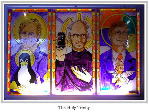 … along with Linus Torvalds and Bill Gates, of course, as part of a stained glass piece spotted on a Chelsea gallery tour recently by tefjr77. I have to say, I find it incredibly funny that Steve holds an iPhone, while Bill Gates is being buzzed by a Steve Ballmer cherub. Charming.