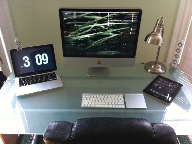 That second setup is awesome, looks like he has almost every Apple gadget known to man! I wish I could get two big screens like that.