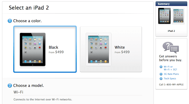 Firstly, you begin by selecting which color iPad 2 you’d like to purchase, and then you pick between the Wi-Fi-only or 3G-capable model. If you’re choosing the latter, you can also pick a carrier.