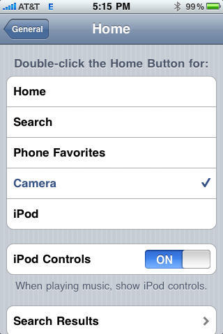 I’m using the camera a lot on the new iPhone 3GS. Instead of going to the Home Screen and hunting for the Camera icon, the camera can be launched with a double tap of the Home button. Go to Settings>General>Home and select “Camera.”