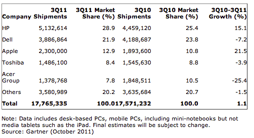 However, neither research firm considers the iPad a PC, giving Apple either 12.9 percent or 11.3 percent of the U.S. market, according to Gartner or IDC. HP is still the No. 1 U.S. PC maker with 28.6 percent of the market, followed by Dell’s 21.9 percent.