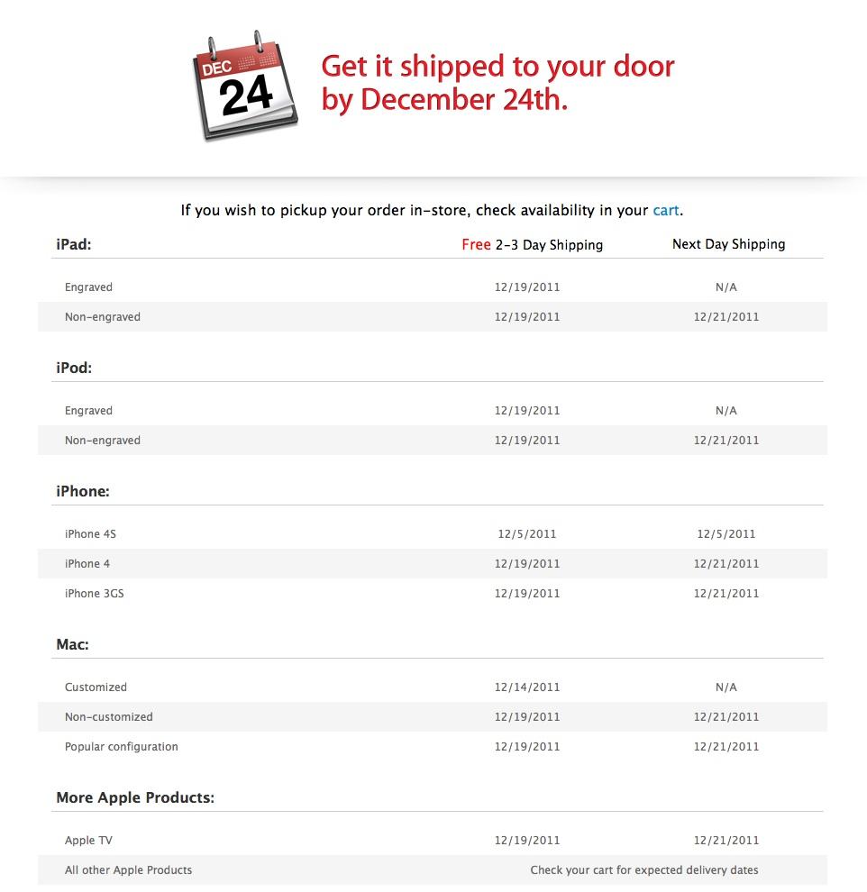 If you’re willing to just buy an off-the-shelf Mac, iPhone 4 or iPhone 3GS, or Apple TV, you need to order by December 21st.