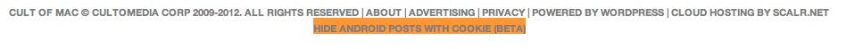 Do you foam at the mouth at having to read about Android on the Cult of Mac? Well, we think it’s important to know what the “enemy” is doing if Apple’s going to beat Google in the mobile space, but if just the mention of Android makes you see red, just click the “Hide Android Posts With Cookie (Beta)” link at the bottom of the page and you should never see Android stories on CoM again. You’re welcome!