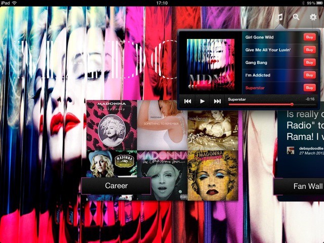 Playing with this app doesn’t feel like you’re engaging with anything. It feels like you’re flipping through a catalog of billboard ads. Sure, there’s a social element – sign in with your Twitter or Facebook account, and you can add comments and raves about Madonna’s every move. But the whole thing feels forced, one-sided, soulless. More about marketing the Material Girl than music.