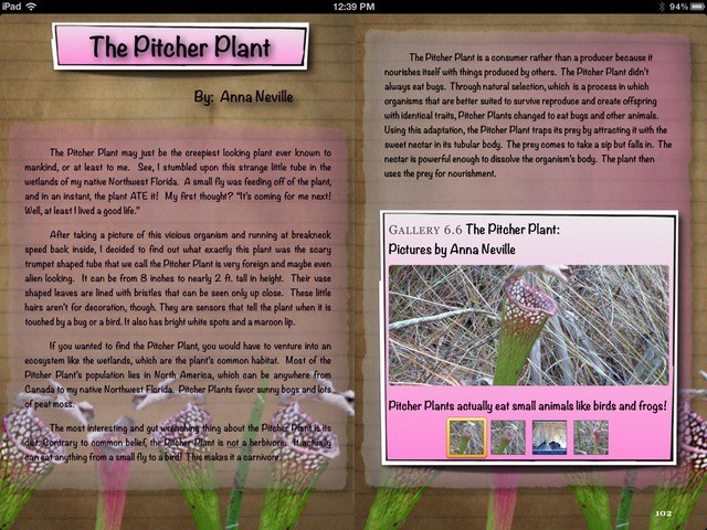 The ebook is very creative and well written (it’s for kids, but the fun facts are interesting for all nature geeks). Sure it’s from a 7th Grade class, and it isn’t like E.O. Wilson’s free book, but I think the kids and their teacher tapped into all the best features of iBooks author. They’ve included: