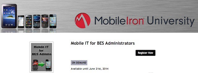 MobileIron is making a specific package of on-demand learning available to BES administrators that includes the following topics: working with LDAP and local users, registering devices, policies, enterprise apps and app control, digital certificates, and integration options with Microsoft Exchange. The program and certification exam can be completed by BES administrators at their own pace.