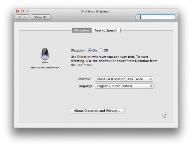 By default in Mountain Lion, Dictation works in any text entry field and can be triggered by hitting the Function key twice. This shortcut can be changed under the “Speech and Dictation” panel in System Preferences to one of four preset shortcuts; curiously, it defaults to pressing the Function key twice even if your Mac keyboard doesn’t have a Function key, which can be confusing at first. You can also trigger Dictation by selecting it under the “Edit” dropdown in a document’s menu bar.