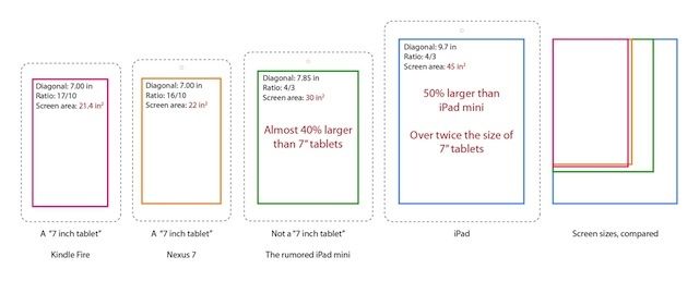 In addition to the almost 8-inch diagonal screen size, the mini iPad will probably have the same ratio of height to width as the current iPad, in a move to support developers to not have to change their graphic production workflow to accomodate yet another iOS device size. It will also probably have the high resolution graphics of an iPad 2, rather than the Retina-quality ones of the new iPad.