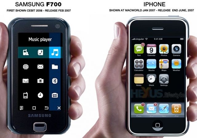 well as far as i know the samsung phone that is similar to the iphone came first, but apple was doing something totally different than samsung, apple is focused on computers and made a phone that would be as good as their computers…but all samsung is doing with their phones is trying to make good phones. which they do. but just not as good as apple. but now as more apple phones are coming out samsung is improving their technology so that it seems better than apple (although it still is and probably will always be inferior)