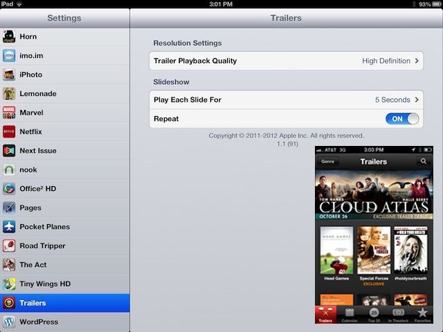 Once it’s downloaded and installed, launch the Settings app and scroll down the left-hand pane to the list of third party apps and tap on Trailers. Tap on the Trailer PLayback Quality and choose High Definition. Boom. You’re done.