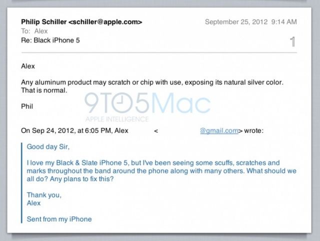 Alex, a 9to5Mac reader who picked up a black & slate iPhone 5, has already begun to notice scuffs and scratches on his device — like a lot of users. So he emailed Phil Schiller to ask whether Apple had any plans to fix the problem. Schiller’s response is surprising: