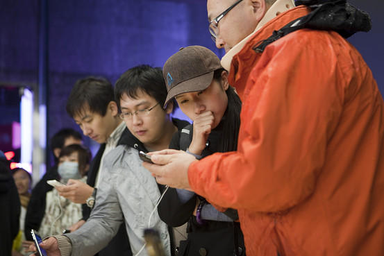 Customers check out the iPhone at a Beijing launch event. (photo: Bloomberg)