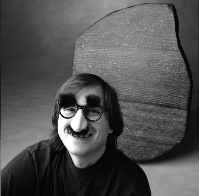 That was when I found it. The best photograph of Steve Jobs I had ever seen. It showed the enfant terrible himself in his wilderness years, sitting in front of the Rosetta Stone, playfully grinning at the camera through a pair of Groucho Marx glasses.
