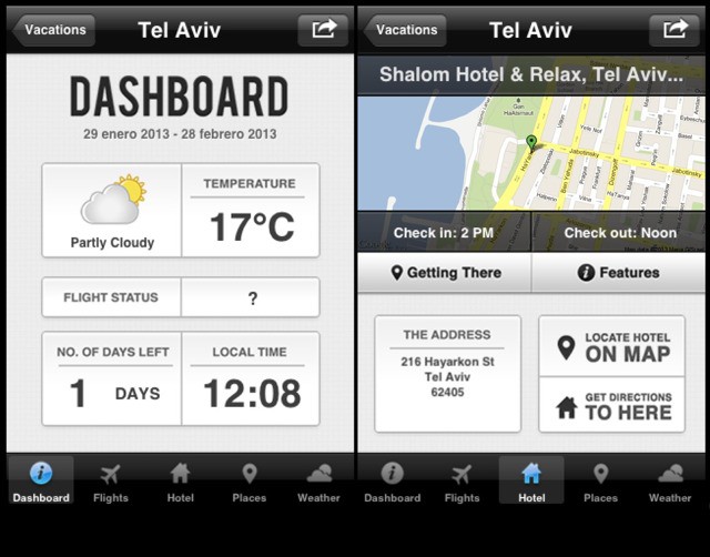 Once that’s out of the way, you have a handy one-stop-shop for all your info. You can see – at a glance – the planned and actual flight times, the address of your hotel, maps, weather and more – even the services the hotel offers.