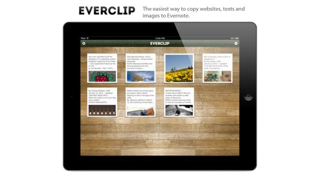 Everclip is a clipboard-based clipper for Evernote. It runs in the background on your iPad (for up to ten minutes, thanks to iOS’ smart battery-saving multitasking) and grabs anything you copy to the clipboard: text, links, pictures, PDFs, anything that can be copied.