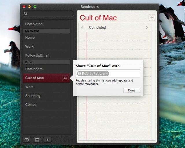 You’ll get a bubble which allows you to type in an address of a person in your Contacts list, or anyone with an iCloud account. People you share the list with can add, update, and delete reminders as well, making this a great way to manage a list with multiple people. The people you share the list with will be able to access the Reminders on their Macs as well as their iCloud enabled iOS devices.