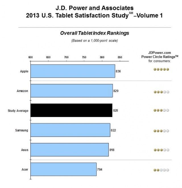 The study average was 828, and Apple and Amazon were the only two companies to beat it. Samsung came in just below with a score of 822, securing third place, while Asus scored 818, and Acer scored 784. 1,857 tablet owners took part in the survey.