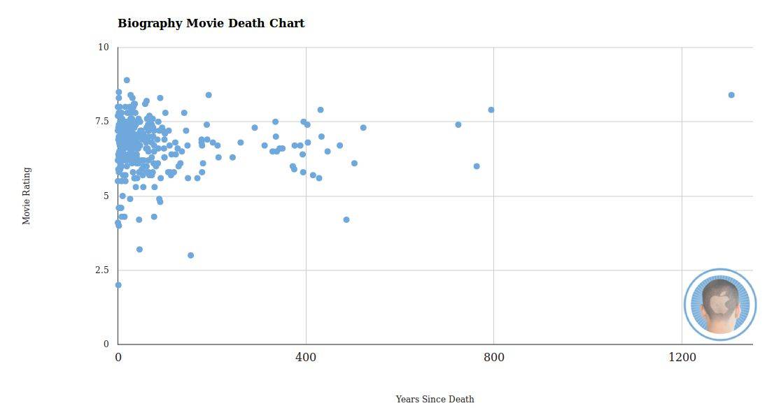 Though I’m not Nate Silver in a skirt, I was curious to see whether there was any link between time elapsed since the death of a biopic’s subject and the quality (or rating) of the film. (As a TV entertainment reporter, I once did a story on the relationship between whether Julia Roberts wore curls and the success of her films. Result: The curls have it.)