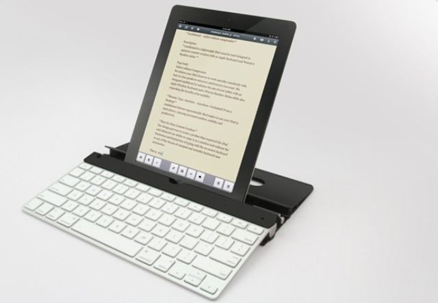 The Nimblstand slides under your Apple Bluetooth keyboard and fills up the space underneath, whilst clipping onto the cylindrical battery compartment. Along the back is a slot like you’ll find on many iPad keyboard cases, and this props up your iPad at a laptop-ian angle for typing. There’s also a slide-out fin/kickstand on the back to keep the whole lot from toppling backwards.