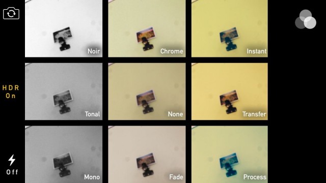 The camera now gets eight filters, picked from a 3×3 grid (the center tile selects “none”), and they’re pretty great. You can see the current “viewfinder” image live in all of these thumbs, and the live filter is also applied full-screen when you’ve chosen the one you want to use. These days my iPhone is almost permanently in the bottom row of filters: Process, Transfer or Instant, but Fade is nice too. The B&W filters are a little over the top for me though – I still use Snapseed for my conversions.