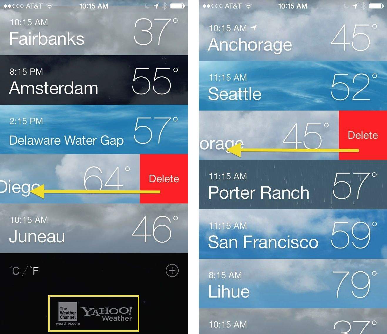 Now you have two ways to see all of your Weather locations. If you want to delete any of them, simply swipe to the left, as in the Mail app, and tap on the red Delete button.