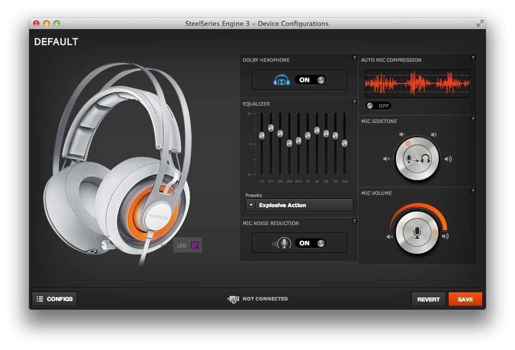 The SteelSeries Engine 3 also provides control of the LEDs on the outside of each earcup, letting users create their own visual style with a steady, pulsing, or volume-responsive LED light show. While it’s definitely on the “extra” side of things, it’s fun to at least easily choose a color that I like, rather than be stuck with the default orange, which doesn’t look too bad in any case.