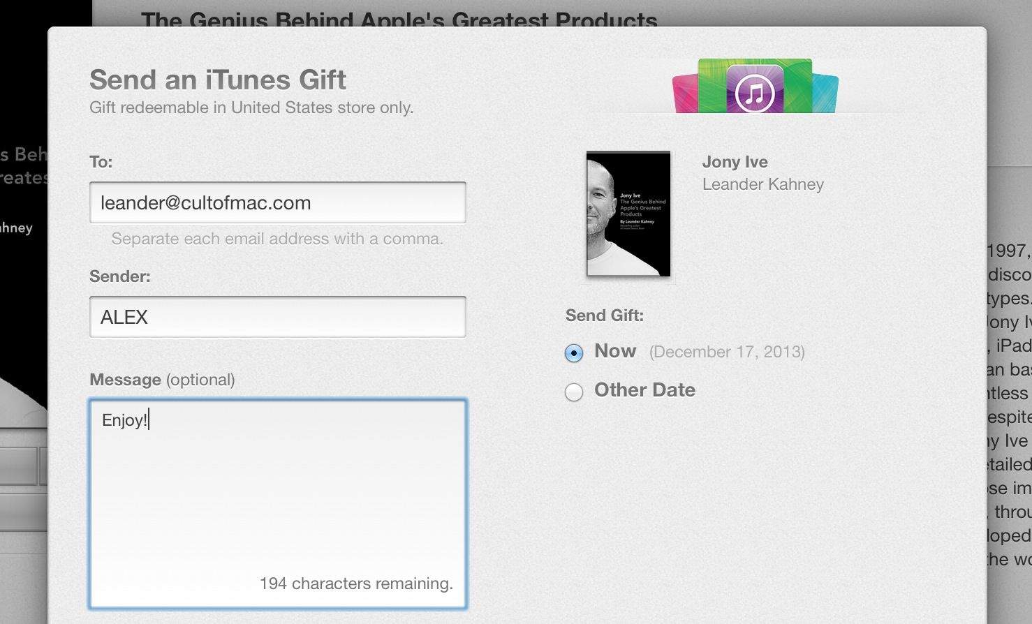 To send an iBook as a gift, you must have the recipient’s email address. You can choose to have it send on a specific date instead of immediately, just in case you want it to arrive on a special day.