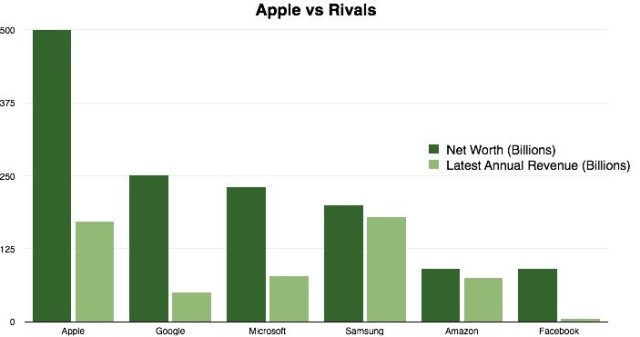 We took a look at the latest reported annual revenues from each of Apple’s major rival tech companies and compared that to each company’s net worth. Facebook hasn’t reported yet for 2013, so that’s older data, and Samsung’s number is their revenue across every one of their divisions, so take the chart above with a grain of salt. What it really shows is that Apple could pretty much buy out one of its major rivals. Maybe even two or three. That’s winning.