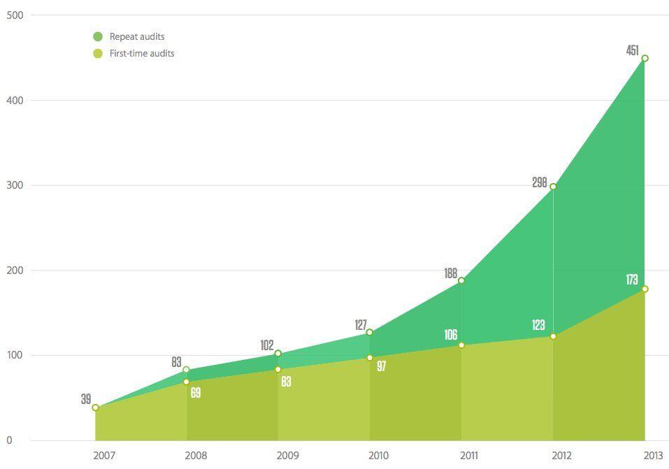 Apple also noted its more stringent focus on the environment, with 62 detailed studies of environmental risks discovered during 520 site profile surveys. However, in 2013 the number of environmental core violations representing “serious breaches of compliance” rose from 4 the previous year to 17.