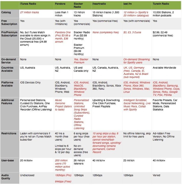 Either way, following on from last week’s column where we compared on-demand music services, we have taken it upon ourselves to narrow down the competition, including iTunes Radio, Pandora, Slacker Radio, iHeartRadio, Last.fm and TuneIn Radio; see the table below. We’ve also done some hands-on testing and in-depth research in order to determine just who has the leading edge and what they offer in terms of functionality, catalog size, features and usability.