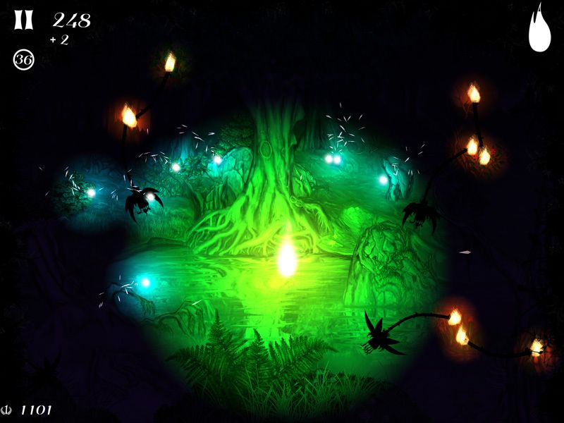 You start with a black screen covered in specks with the sounds of a forest at night. Brighter lights start drifting down from the top, and you run your finger along the screen. Sparks fly and grow and burst into flame, and then you’re playing one of the most unique games I’ve ever seen.