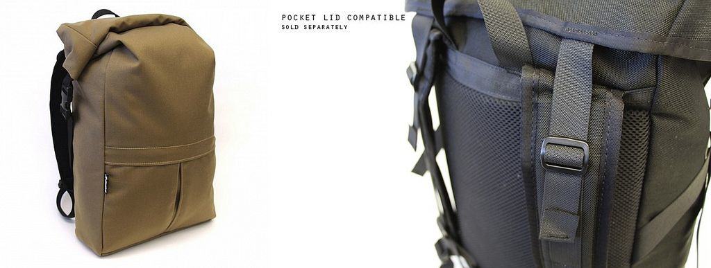 And finally, if you don’t like roll-tops, there’’s and optional Pocket Lid that covers the top and puts a zip-up pocket in a flip-over flap.