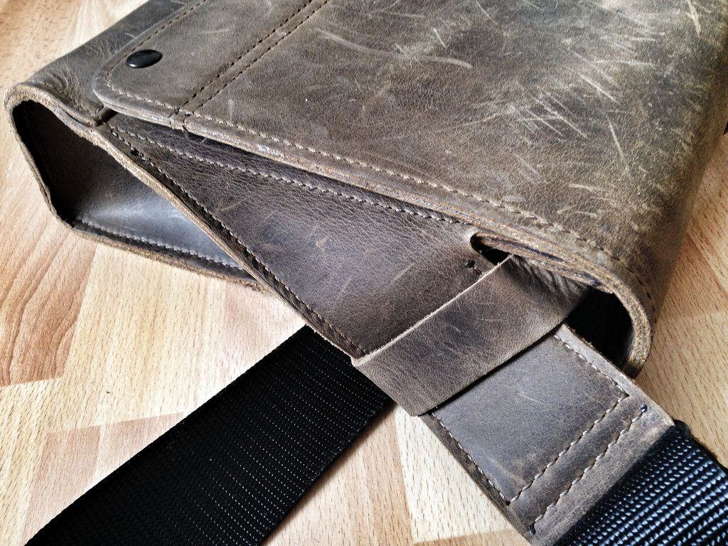 The bag’s strap is made from a material similar to seatbelt webbing, but a little thicker and more textures, and a big leather flap covers the bag, and fastens with press-studs, snapping shut in one of tow positions depending on how full you have packed the bag.