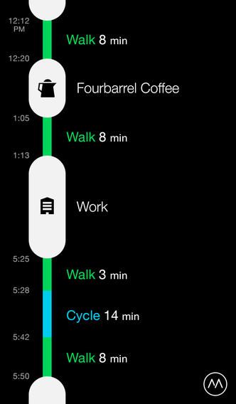 A timeline shows where you went during the day, including the exact distance traveled between destinations. Besides functioning as a pedometer, Moves is able to keep track of calories burned.