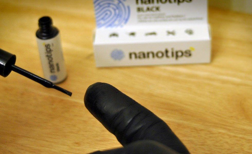 Nanotips looks like a little jar of nail polish or lip-gloss, and contains a liquid polyamide solution, impregnating your gloves with conductive goodness that will convey your finger’s fleshy intents through the barriers of wool, leather, cotton or anything else.