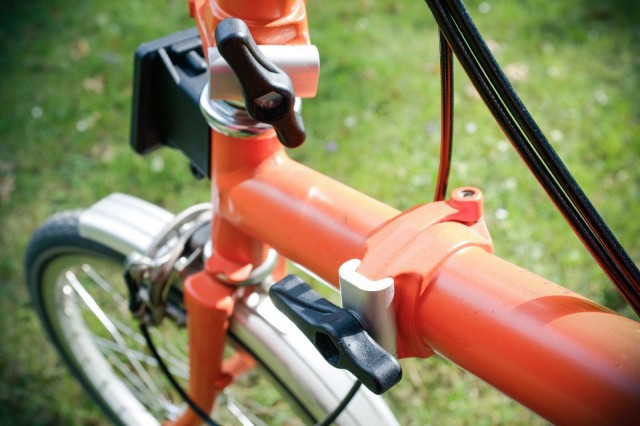 The four-stage fold is possible thanks to ingeniously placed joints in the frame and handlebar stem, plus a chain tensioner that lets the rear triangle swing forward and under. Most folders keep the chain-line intact, resulting in a bigger package, whereas the Brompton folds the chain like a game of cat’s cradle, letting it crunch up even smaller. To finish the fold, the seat slides down and locks everything into place. You can even lift the folded bike up by the seat and carry it (not far though – a approximately 12-kilogram lump of steel isn’t so easy to lug).