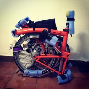 In short: I remove the Brooks saddle from the bike (the rails on the saddle would bend if the whole case got dropped on its head) and cover the top of the seat post with a tennis ball (with a cross cut into one side to make a hole). Then I stuff precut lengths of pipe lagging between the fenders and the wheels, remove the two bolts that secure the frame when it’s in unfolded mode, and use Velcro straps to attach more foam lagging to anything that sticks out. Here are a couple photos, taken before my first trip to the United States with the bike. The setup hasn’t changed since.