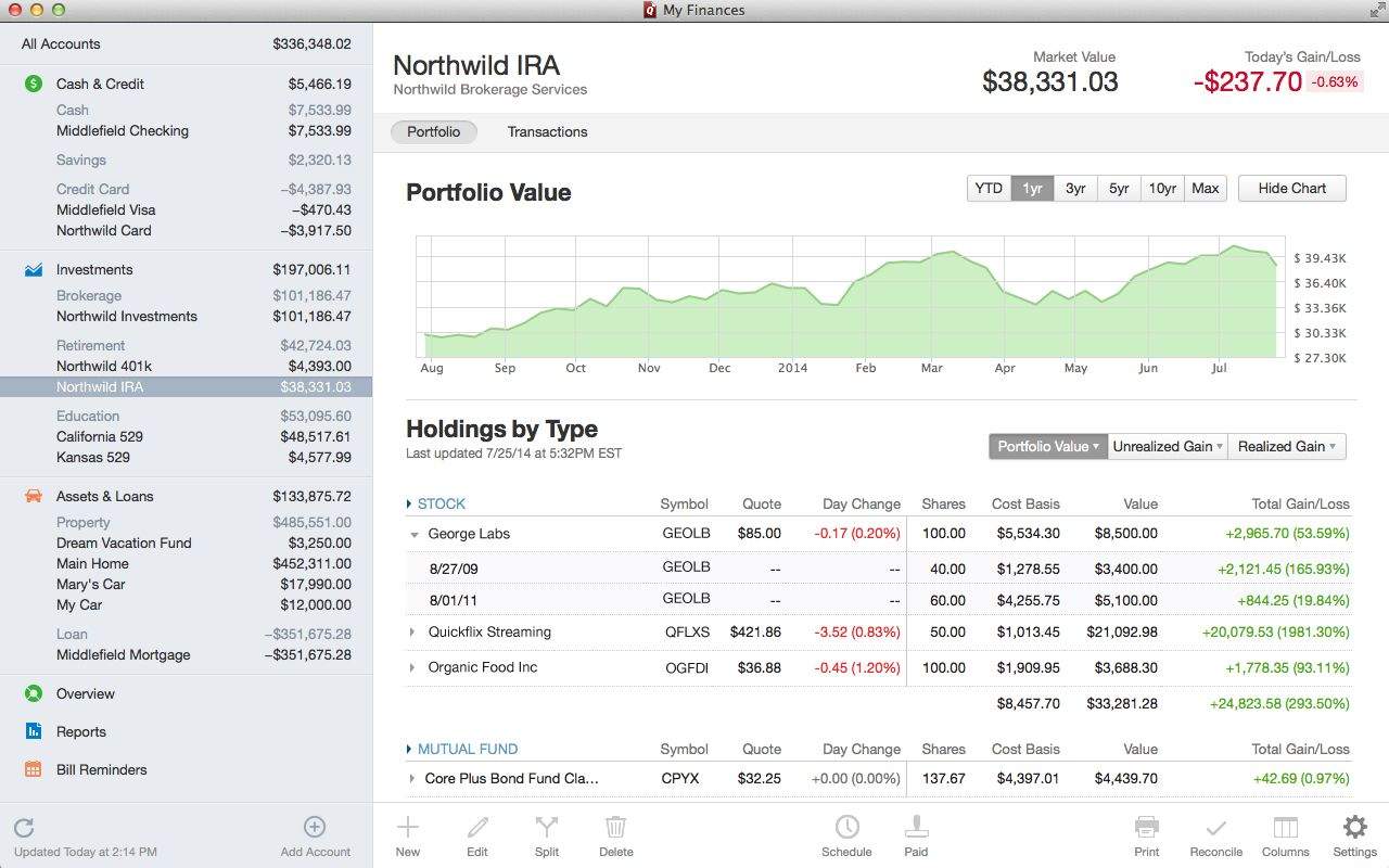 You can make Schedule D tax reports for your accountant, make different budgets, track stocks and other investments as their values change, and see a forecast for upcoming income and expenses. The new iOS app is for seeing account balances, transactions, budgets, and receipt storing with the iPhone’s camera.