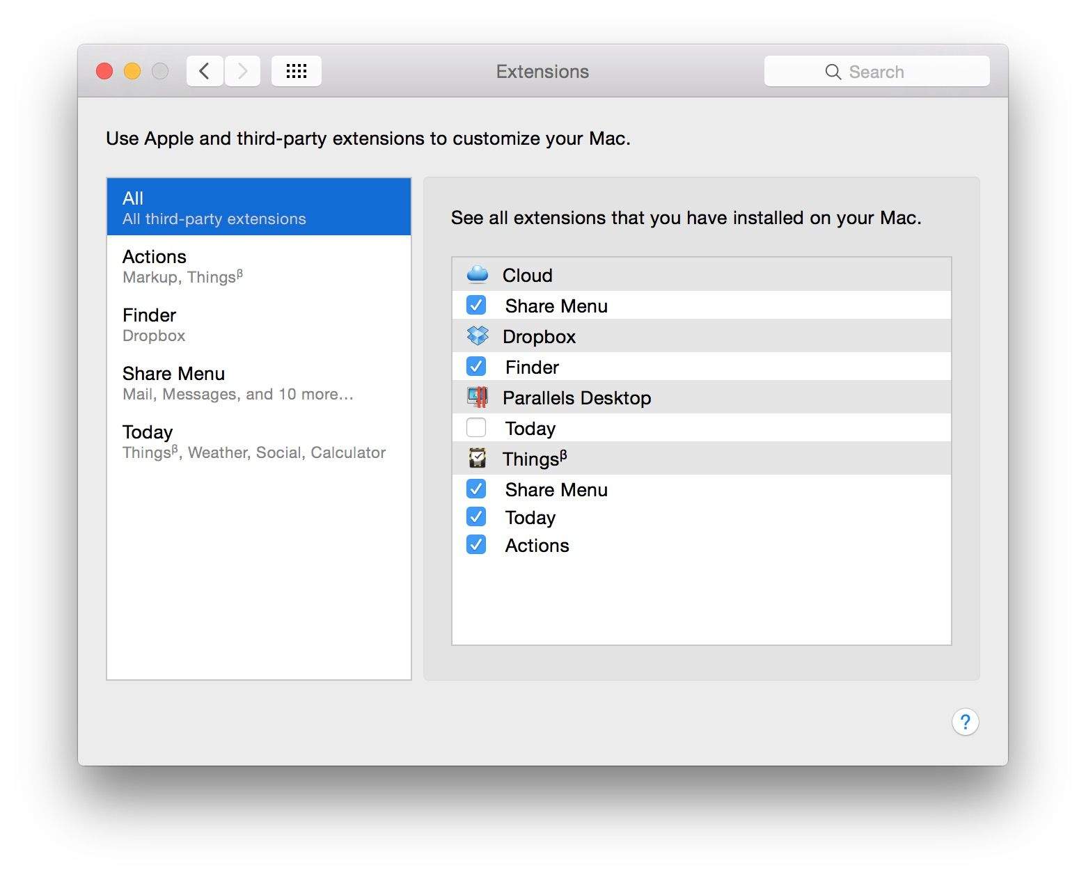 The new Extensions section of System Preferences shows all the apps with extensions you currently have installed.